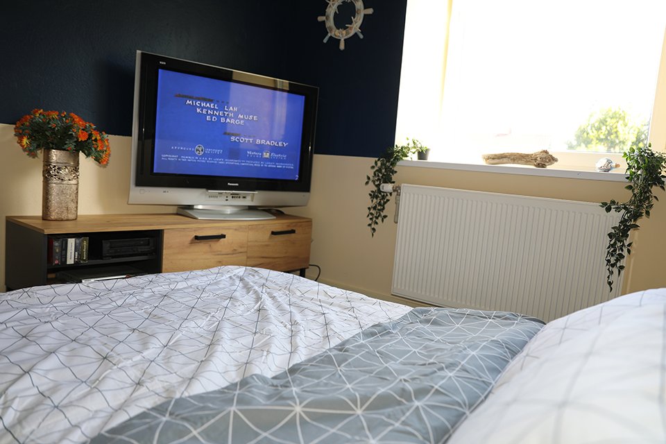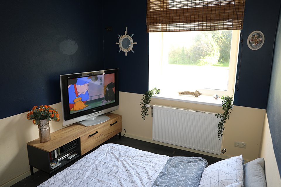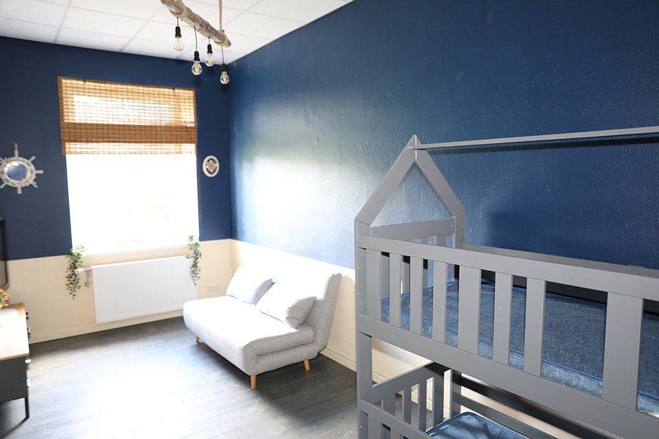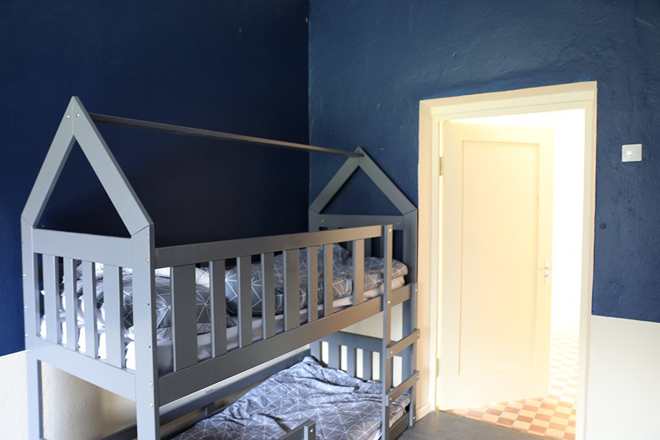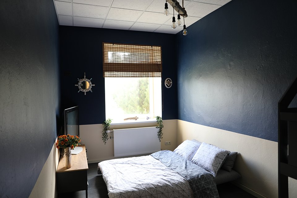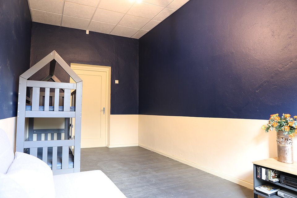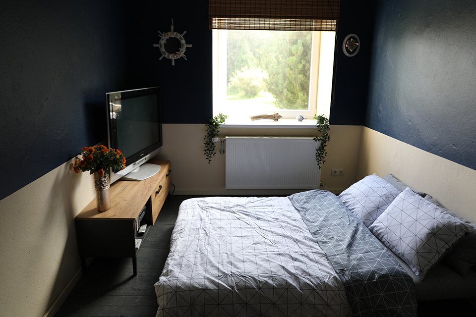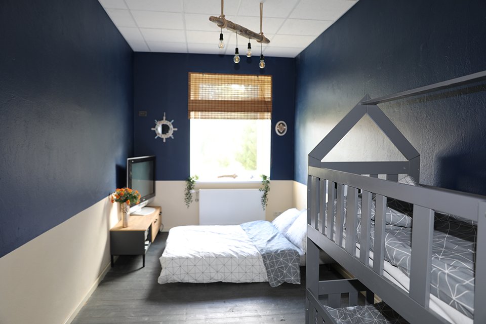 Gaišs un mājīgs numurs ar ērtu divguļamo dīvāngultu un divstāvīgu bērnu gultu.