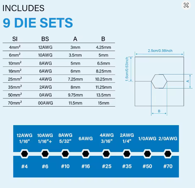 • Hroma pārklājuma sešstūra matricas (8 gab.): 4, 6, 10, 16, 25, 35, 50, 70 mm²