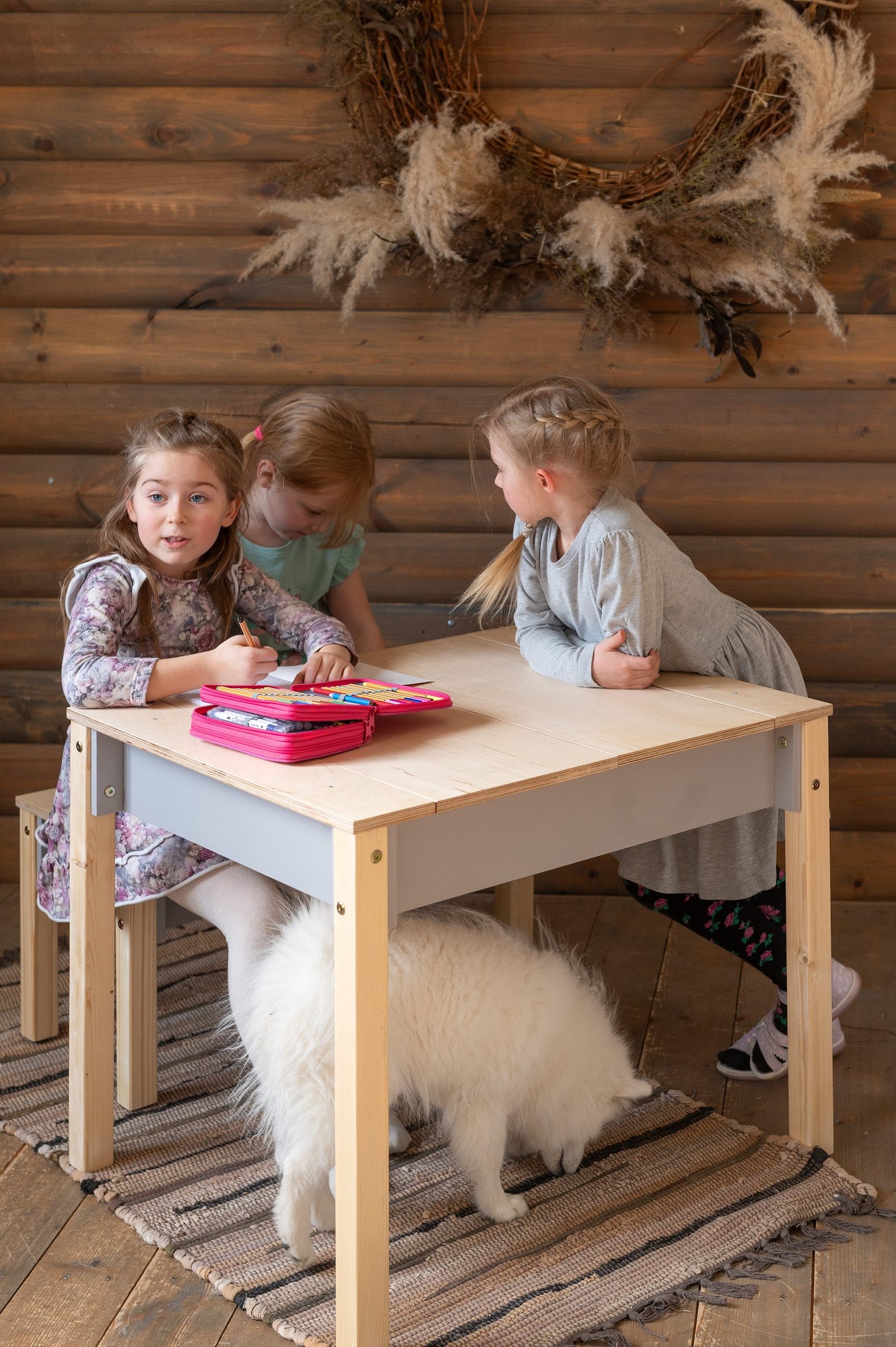 Viedais galda un krēsla komplekts ir izgatavots no 100% bērniem droša bērza saplākšņa. Konstrukcija ir stabila, izturīga un piemērota ikdienas lietošanai, nodrošinot drošu vidi jūsu bērna radošajām un mācību aktivitātēm.