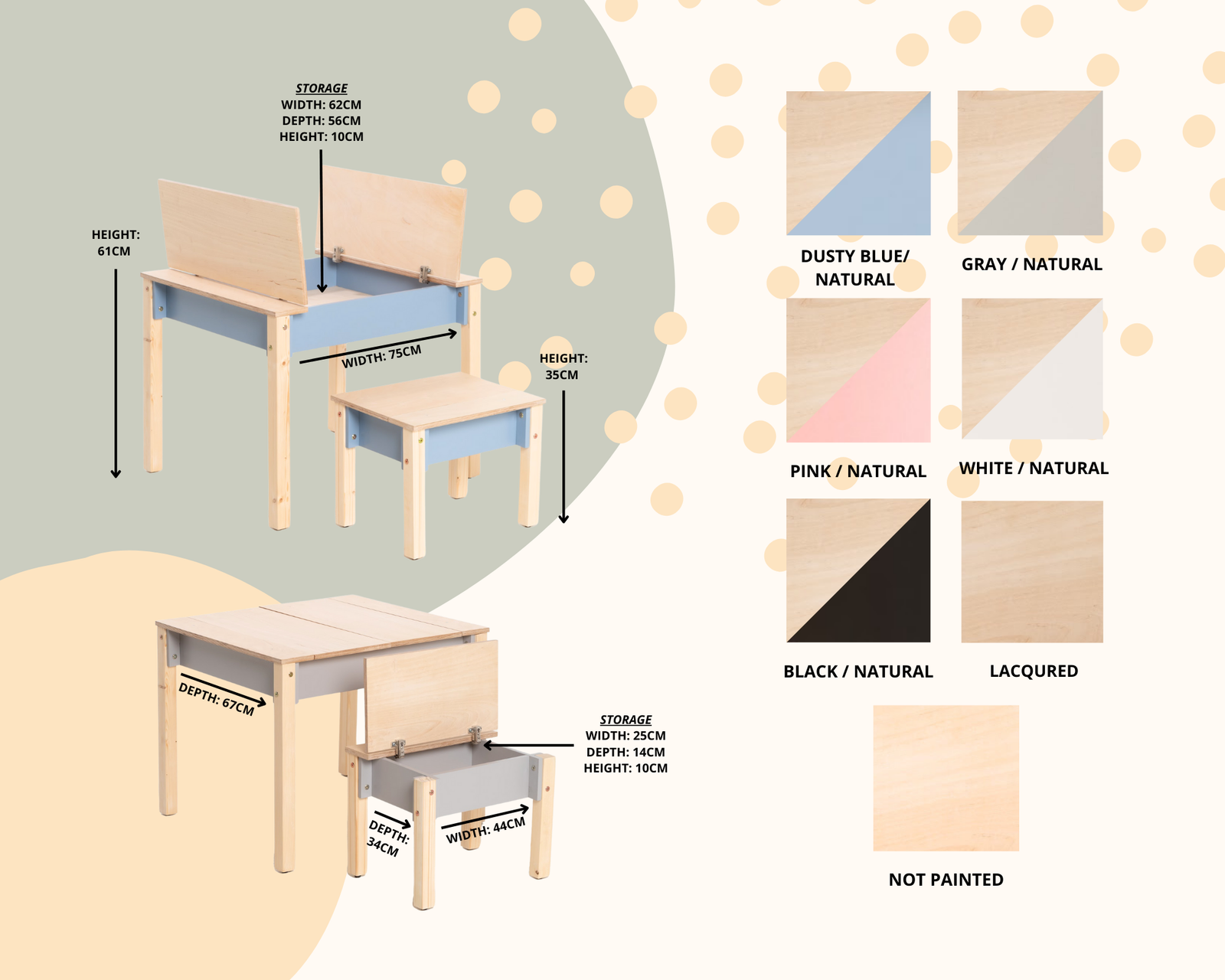 - Iebūvēti uzglabāšanas nodalījumi – Gan galdā, gan krēslā ir slēptas vietas mantu glabāšanai, kas palīdz uzturēt kārtību un veicina koncentrēšanos.